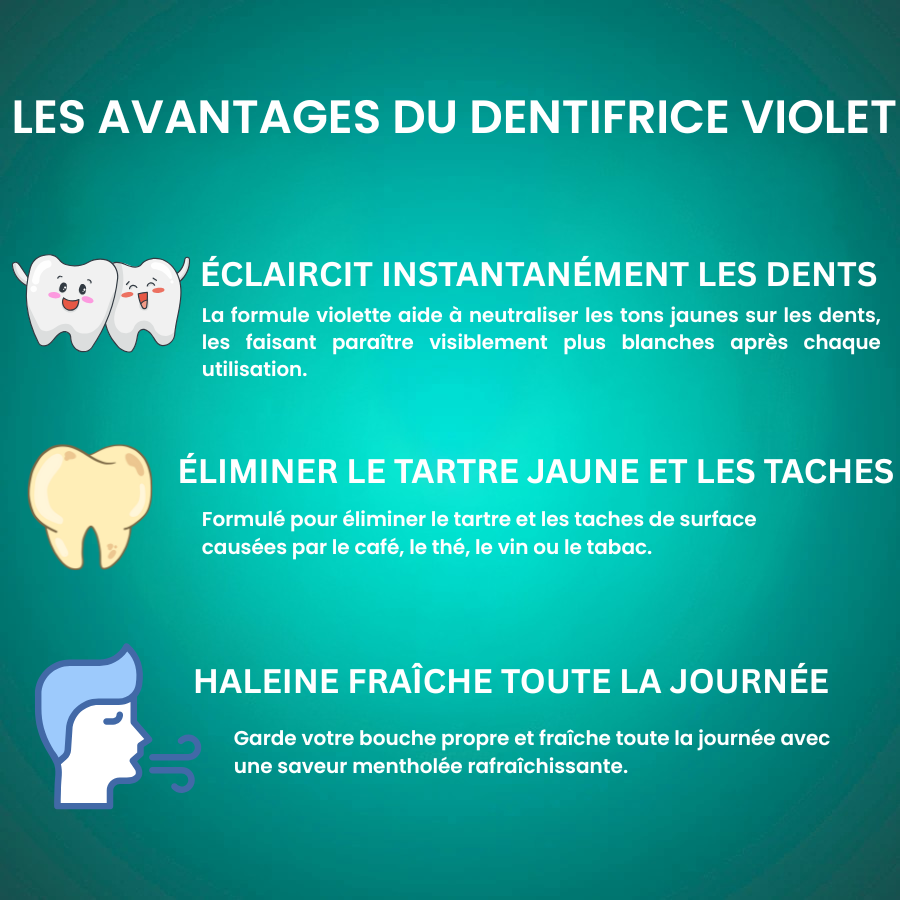 Découvrez notre Dentifrice Violet innovant, spécialement formulé pour raviver l'éclat naturel de vos dents.